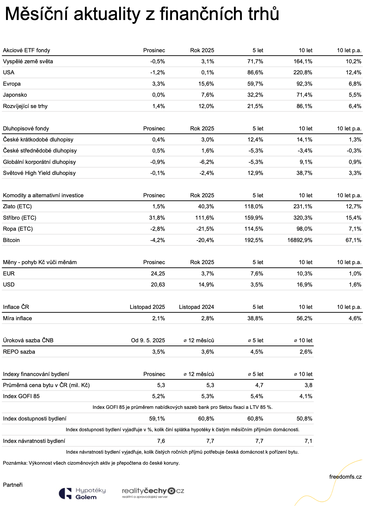 V prosinci 2025 nepřinesly finanční trhy česko-korunovému investorovi mnoho potěšujících zpráv. Za celý rok jsou ovšem zaznamenány zisky v případě všech sledovaných skupin akcií, českých dluhopisů, zlata a stříbra. Dvouciferné růsty dodaly evropské akcie a rozvíjející se země, nakonec i zlato; stříbro hrálo úplně jinou hru (111,6 %). Hlavní roli v loňském roce hrál oslabující dolar, což „kazí“ výsledky dosavadnímu majetku, ale na druhou stranu tato situace umožnila levnější nákupy cizo-měnových aktiv, což se přímo projevuje v ziskovém potenciálu portfolia.Minulá výkonnost není spolehlivým ukazatelem budoucí návratnosti. Všechny aspekty a rizika investování je třeba pečlivě zvážit. V případě jakýchkoliv dotazů se neváhejte obrátit na poradce Freedom.
